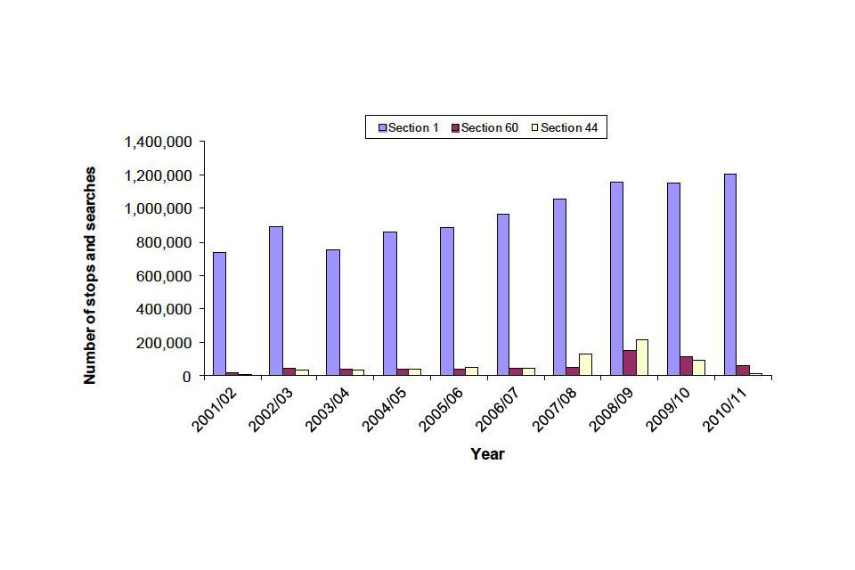 1,222,378 stops and searches under section 1 of the Police and Criminal Evidence Act (PACE), an increase of four per cent on 2009/10. Nine per cent of the section 1 stops and searches in 2010/11 resulted in an arrest. 60,963 stops and searches in anticipation of violence (under section 60 of the Criminal Justice and Public Order Act 1994), a 49 per cent decrease compared to the previous year. 11,792 stops and searches in order to prevent acts of terrorism (under section 44 of the Terrorism Act 2000), a decrease of 89 per cent on 2009/10.