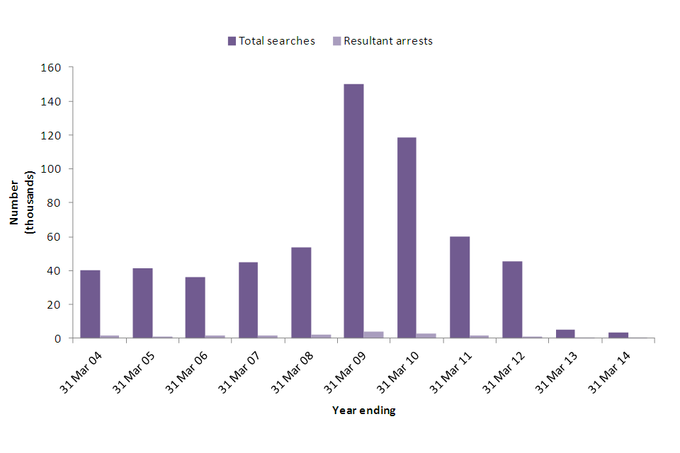 - there were around 900,000 stops and searches carried out by police in England and Wales in the year ending 31 March 2014, a 12% fall compared with the previous year