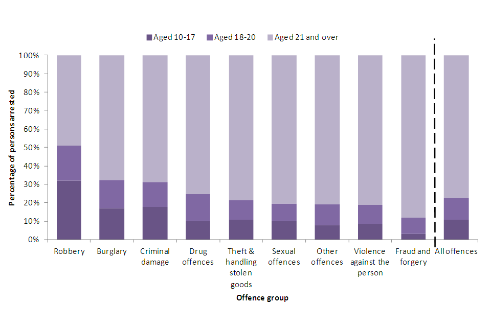 The ages of those arrested were similar for males and females, with over three-quarters of all arrestees being 21 or over. Excluding those whose age was unknown, and those who were under 10 at the time of arrest (i.e. under the legal age limit for arrest), the majority (between 64% and 86%) of those arrested fell into the 21 and over age group for all offence types, although to a lesser extent for robbery, where only 49% of those arrested were aged 21 or over. Around a third of people arrested for robbery were aged 10 to 17 and the remaining 19% were aged 18 to 20.