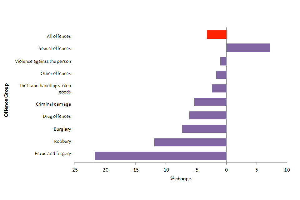 - recorded crime (excluding fraud offences) fell by 1% compared with the previous year