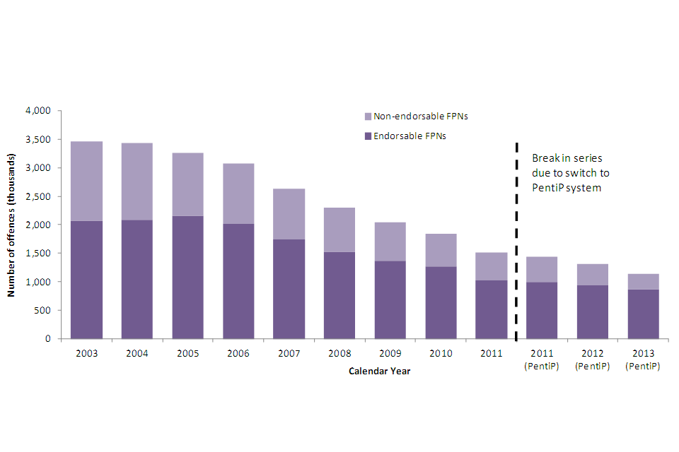 There were 1.15 million FPNs for motoring offences issued by the police (including police-employed traffic wardens) in 2013, a fall of 13% compared with 2012. Since peaking at 3.5 million in 2003, there have been year-on-year decreases in the total number of FPNs issued. Caution must be taken when comparing figures over time, as from 2011, FPNs were recorded using a new system (PentiP), which showed some differences with the existing system (see the user guide for details).