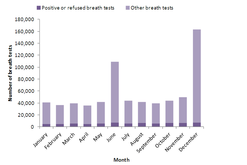 Despite the much higher numbers of breath tests in June and December, the number of positive or refused tests as a proportion of total tests was lower in June (6%) and December (4%), than the average of the other 10 months (14%).