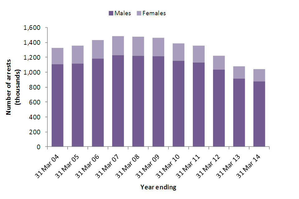 Of the 1,041,221 arrests carried out in the year ending 31 March 2014, the majority (879,285, or 84%) were of males, which is consistent with previous years where males have accounted for between 83% and 85% of all arrests.