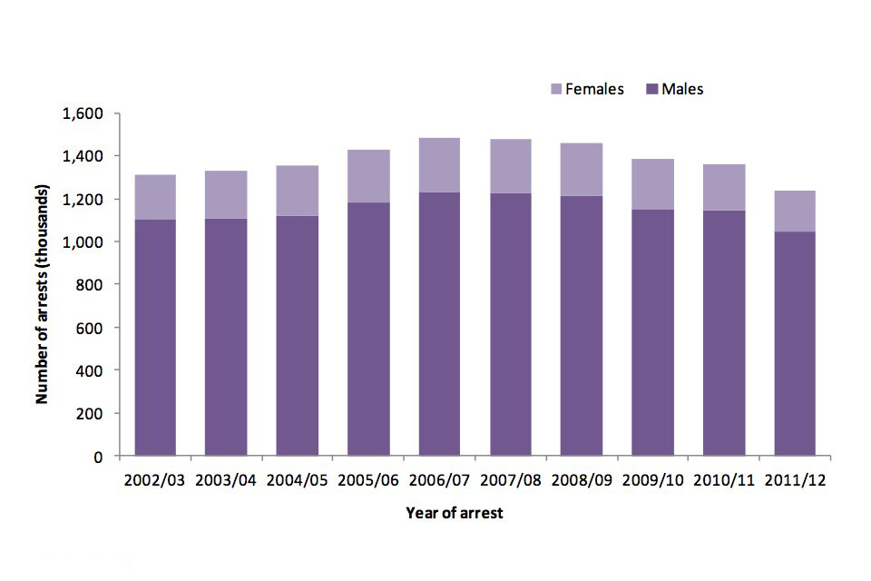 Arrests of males and females both fell in 2011/12, with male arrests decreasing by 97,570 (9%) to 1,044,230, and female arrests decreasing by 29,367 (13%) to 190,798.