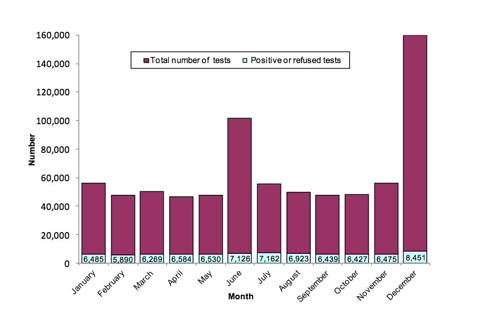 Despite the much higher numbers of tests in June and December, compared with the other 10 months, there was a more modest increase in the number of positive/refused tests. There were 9% more positive/refused tests in June and 30% more in December, compared with the average of the other 10 months.