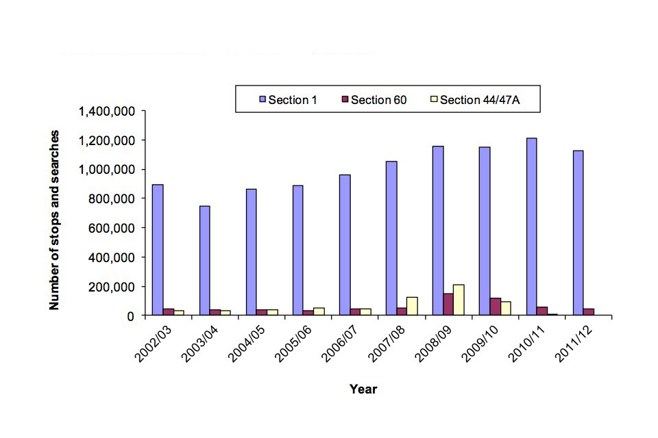 Number of stops and searches from 2002/3 to 2011/12 by legislation, sections 1, 60 and 44/47A.