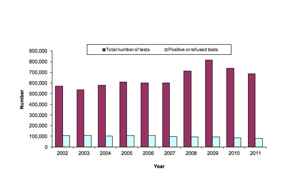 - The police carried out 685,992 screening breath tests during 2011, 7% fewer than in 2010. The number of positive or refused tests also fell by 4% and accounted for 12% of the total.