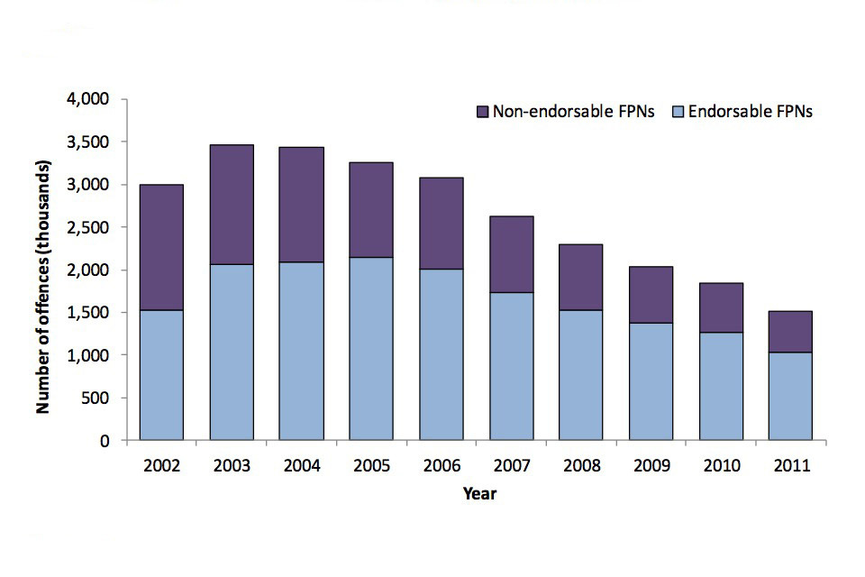 There were 1.5 million FPNs for motoring offences issued by the police (including police-employed traffic wardens) in 2011, an 18% fall on 2010. Since peaking at 3.5 million in 2003 there have been year-on-year decreases in the total number of FPNs issued.