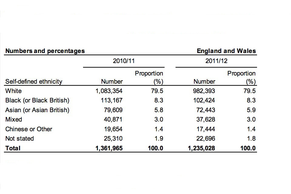 Whilst some ethnic breakdowns are provided here, detailed figures and analysis continue to be the responsibility of MoJ. The latest edition of its ‘Statistics on Race and the Criminal Justice System’ series is online at ‘Race and the criminal justice system 2010’. However, it should be noted that the figures presented in the latest edition relate only to the years up to and including 2009/10, and may since have been revised. The next edition of ‘Statistics on Race and the Criminal Justice System’, with figures up to and including 2011/12, is expected to be published in the autumn of 2013.