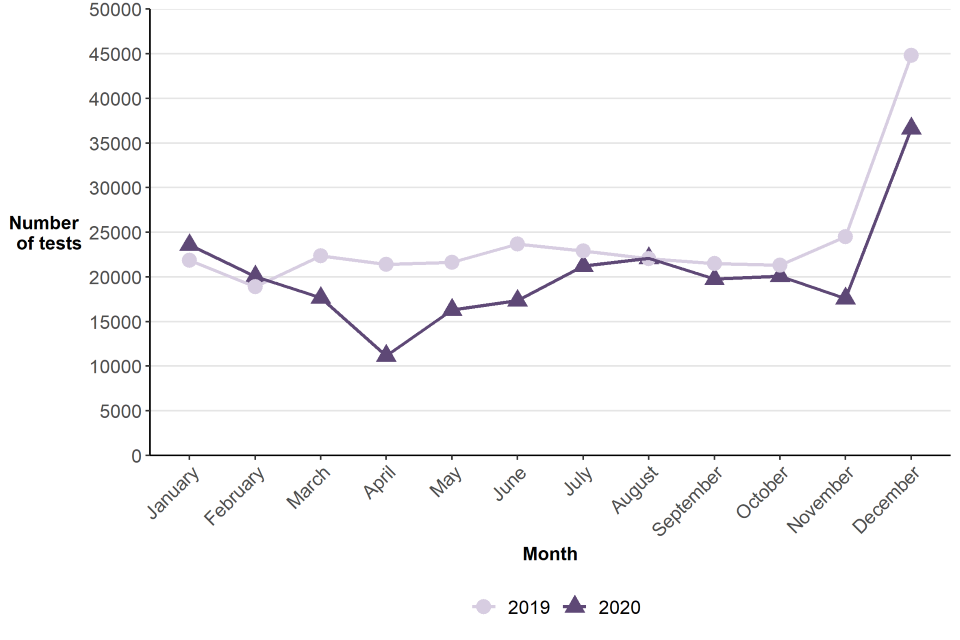 The overall fall in breath tests in 2020 was driven by a decrease in tests during periods of national lockdown and tiers restrictions. April 2020 saw a 49% fall in the number of breath tests performed compared to April of the previous year. March, May, June and November also saw notable falls in tests.