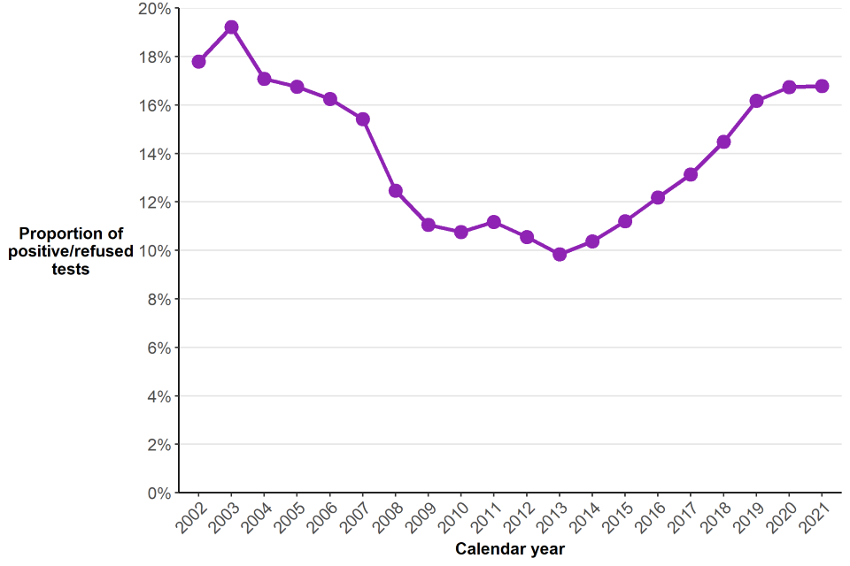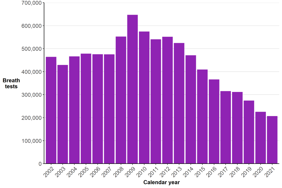 The breath tests section contains data from 40 police forces in England and Wales on a calendar-year basis. It includes statistics on the number of alcohol screening breath tests carried out by police and tests that were positive or refused.
