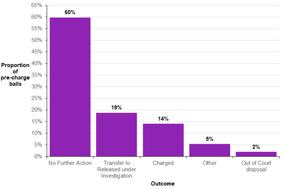 Warwickshire did not provide data in the new format, and Gwent, South Wales, South Yorkshire, and West Mercia were unable to provide details on the outcome of their pre-charge bail records due to issues with their data recording system. City of London, Lancashire, and Wiltshire were unable to provide any data for the latest year. ↩