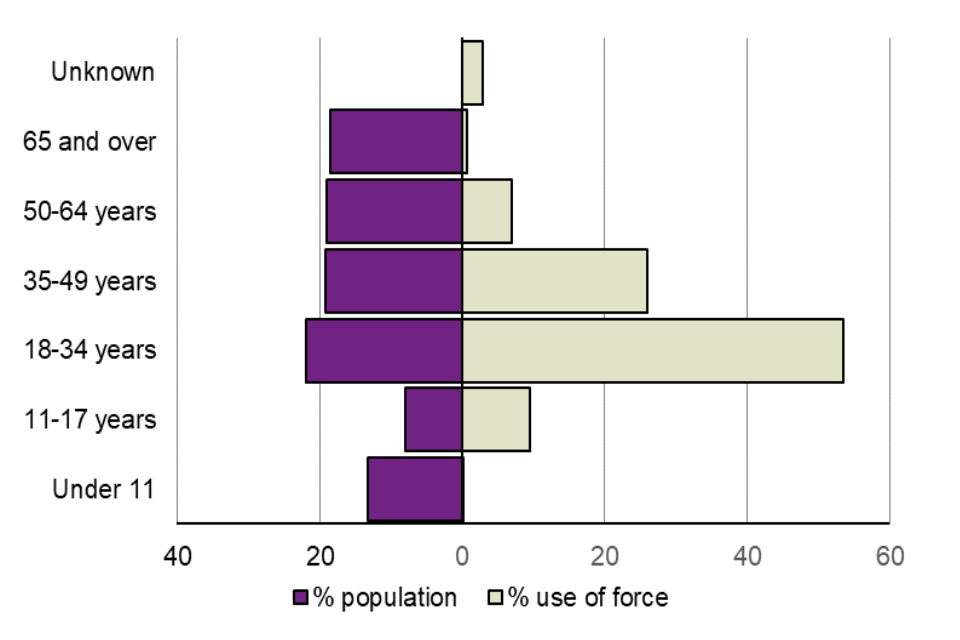 Table 1 shows that people perceived as 11 to 17 years old accounted for 10% of incidents, but experienced proportionally fewer less-lethal weapons and firearms (7% and 5% respectively).