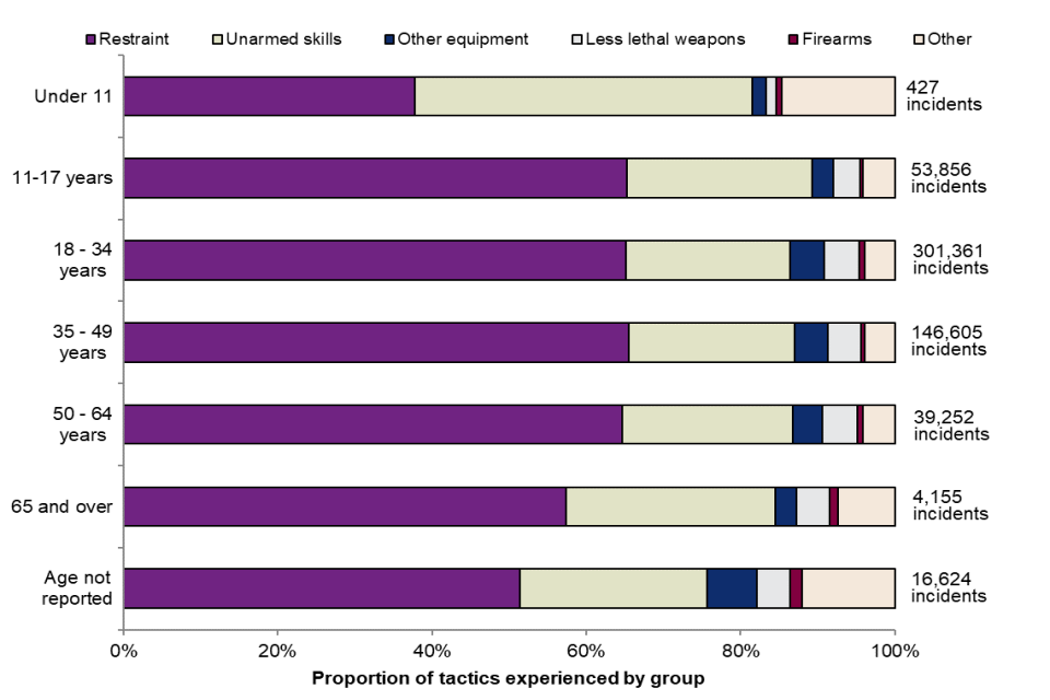 Over half (54%) of the recorded use of force incidents involved people perceived as being between 18 to 34 years old (301,361 incidents). There were 54,283 incidents involving people who were perceived to be under 18 (10%) and, of those, 427 were under 11 (0.1% of all incidents). The majority of tactics used on those under 11 were restraint tactics or unarmed skills (81%). In addition, there were 6 incidents that involved CEDs (1 incident where the CED was discharged, and 5 where the CED was not discharged).