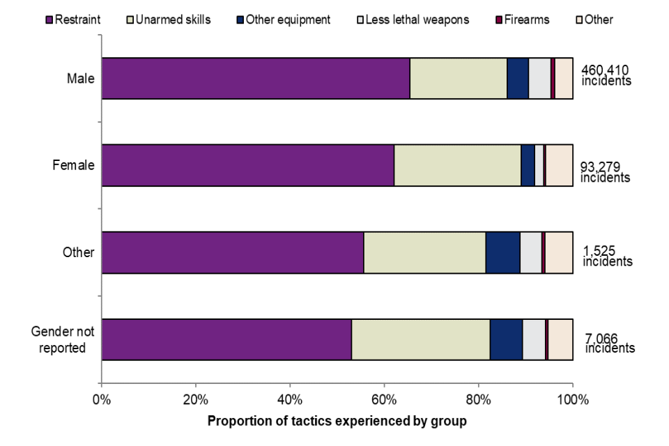 Restraint tactics (e.g. handcuffing) were the most common type of force used (447,496 incidents, 80%).