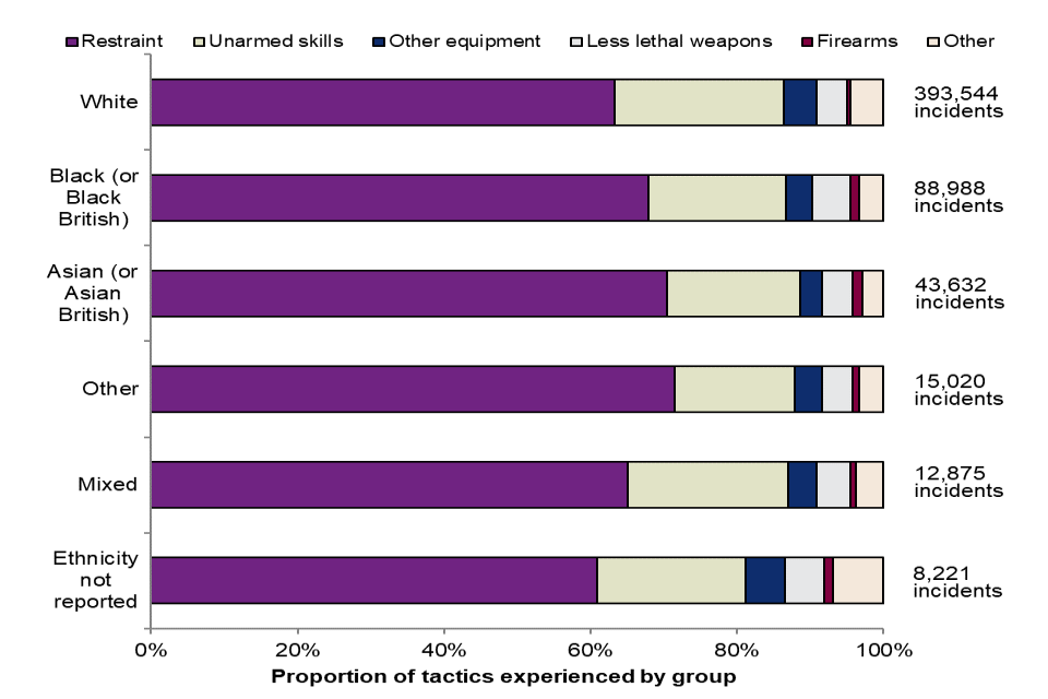 The number of incidents does not tell us how many individual people experienced police use of force, but rather how many times force was recorded by police officers. In a situation where three police officers restrained one individual on the ground, and one of those officers then handcuffed the individual, there would be three separate use of force reports submitted (one by each officer). These would be counted in this release as three ‘incidents’. All three reports would include the details of the incident (location, for example) and the person’s details (as perceived by the reporting officer). The report would also include the tactics the reporting officers used (i.e. two reports would list ground restraint only, and one report would list both ground restraint and handcuffing).