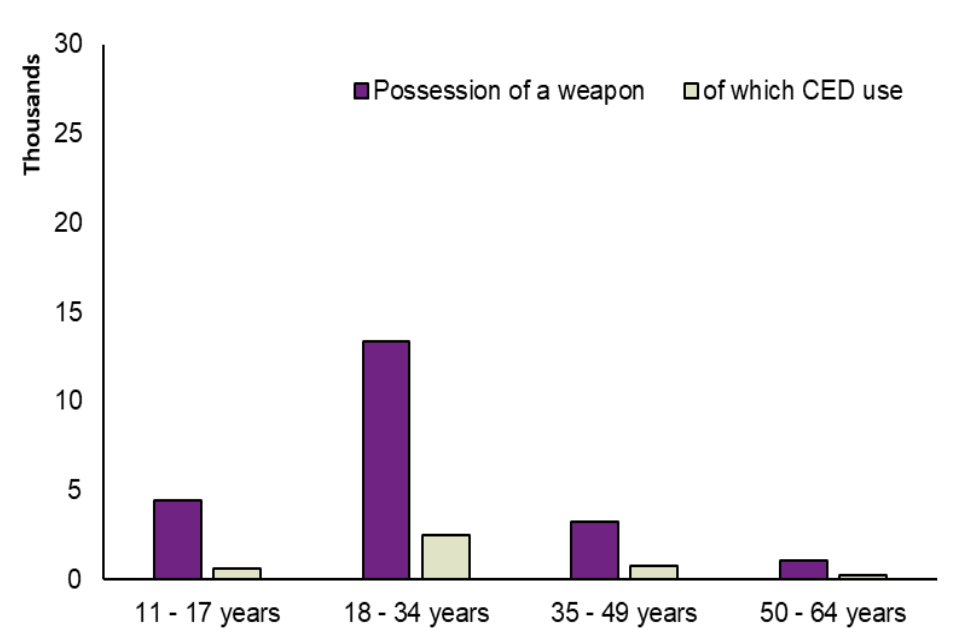 Figure 12 shows that the age breakdown of those involved in CED incidents, and, of those, where possession of a weapon was an impact factor. 57% of all CED incidents involved people perceived as aged 18-34 years, and possession of a weapon was an impact factor of in 55% of these incidents.