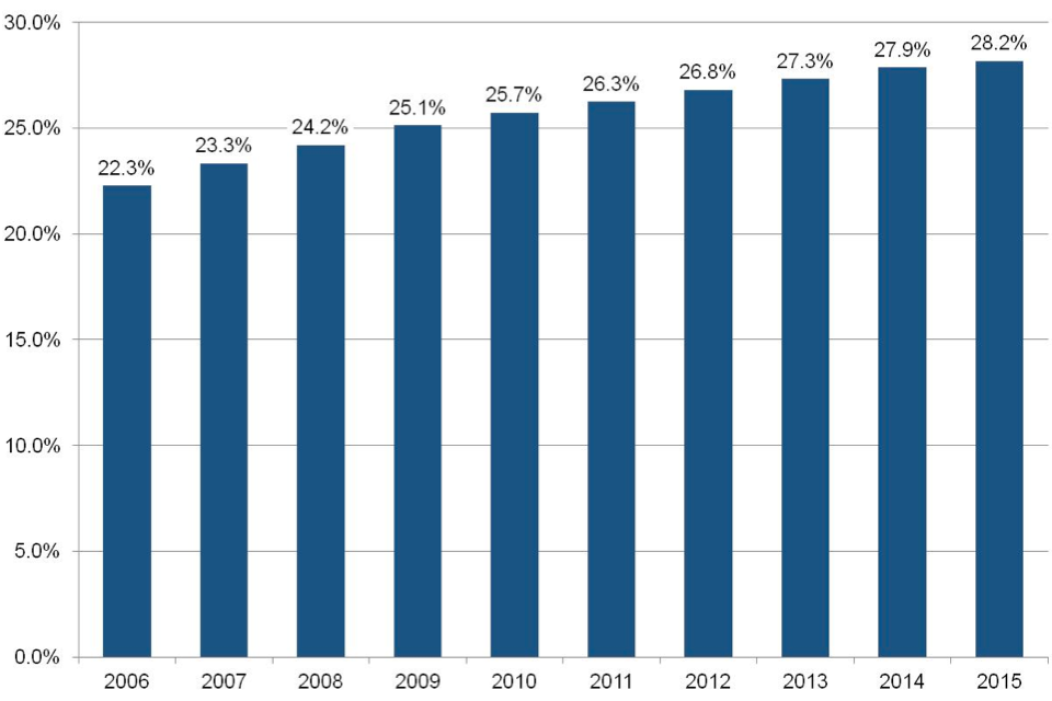 Figure 7 shows how the proportion of female police officers in the 43 forces has increased in recent years from 22.3% in 2006 to 28.2% in 2015.