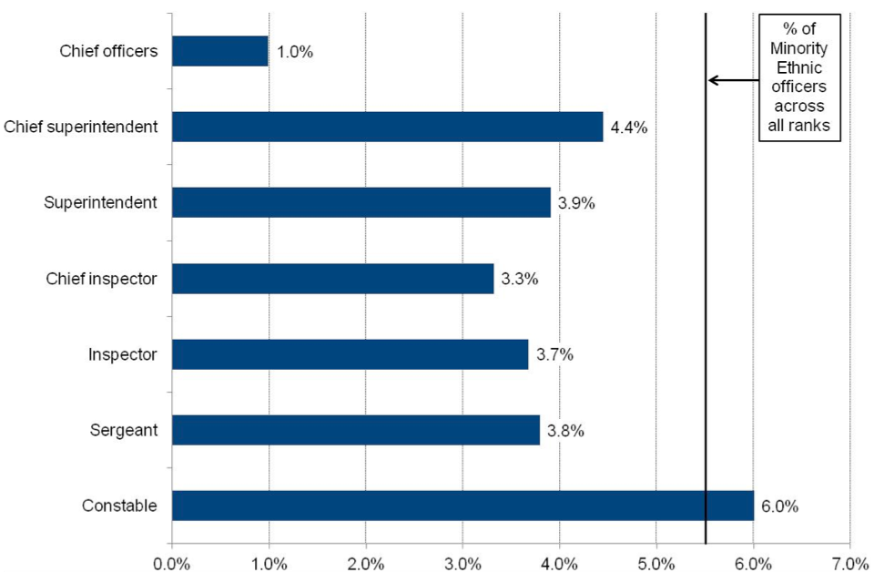 Figure 9 shows that senior ranks (i.e. chief inspector or above) had a lower proportion of Minority Ethnic officers compared to constables across the 43 police forces. For example, 3.4% of chief inspectors or above were Minority Ethnic, compared with 6.0% at constable rank.
