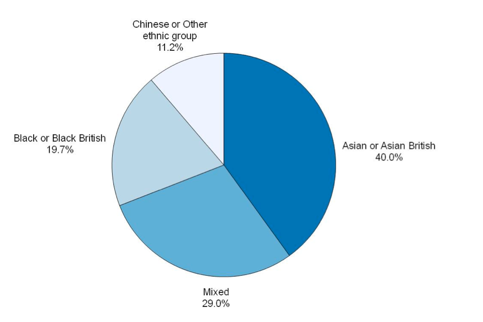 Figure 10 shows that, of those Minority Ethnic officers in the 43 police forces who indicated their ethnicity, 40.0% classified themselves as Asian or Asian British, 29.0% as Mixed, 19.7% as Black or Black British and 11.2% as Chinese or Other ethnic group.