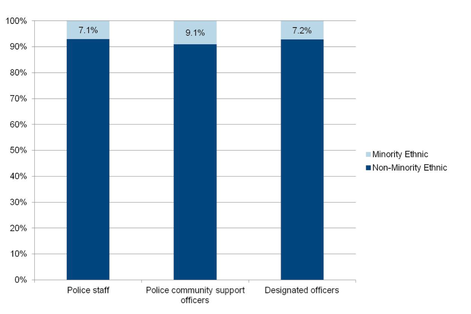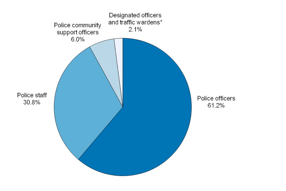 2. These figures include police officers, police staff, police community support officers, designated officers and traffic wardens. They exclude special constables.