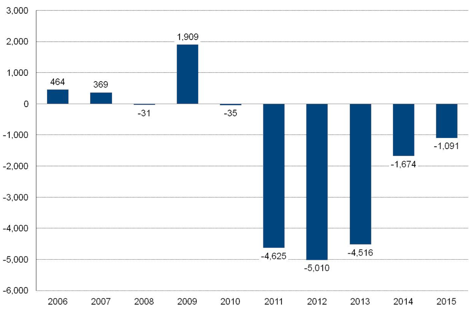 Figure 5: Change in the number of police officers, as at 31 March 2006 to 2015, compared with the previous 12 months, England and Wales1