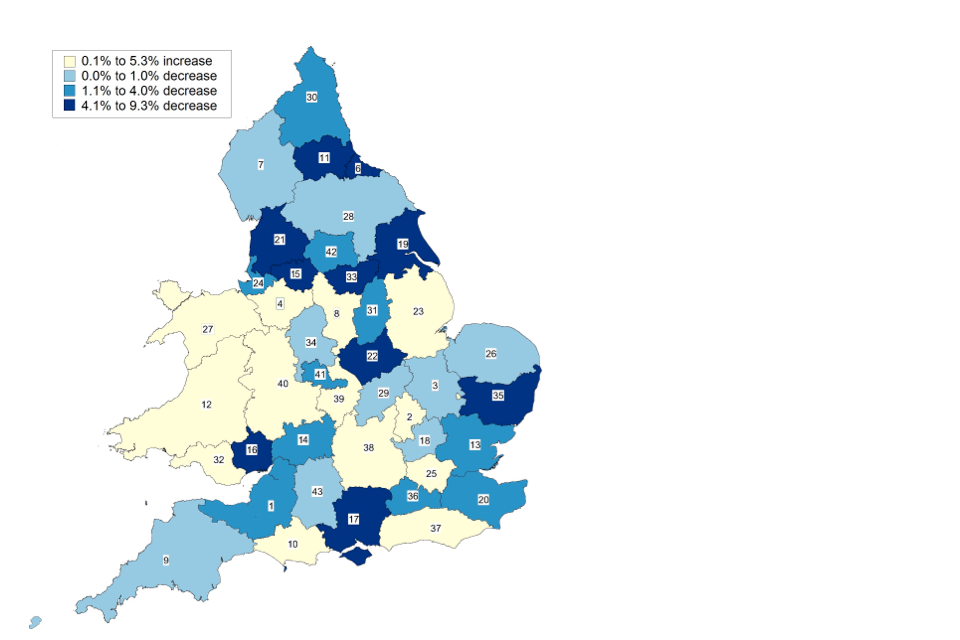 Officer numbers decreased in the remaining 30 forces. Durham (-119 officers or -9.3%) fell the most in percentage terms, whilst Greater Manchester (-294 officers or -4.2%) experienced the largest numerical decrease (Figure 3 and Table 9).
