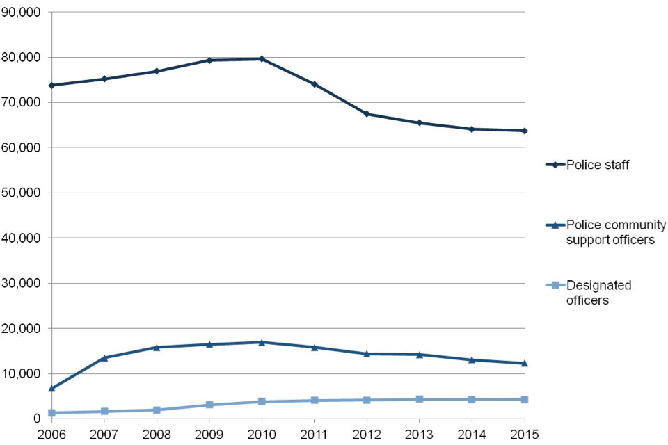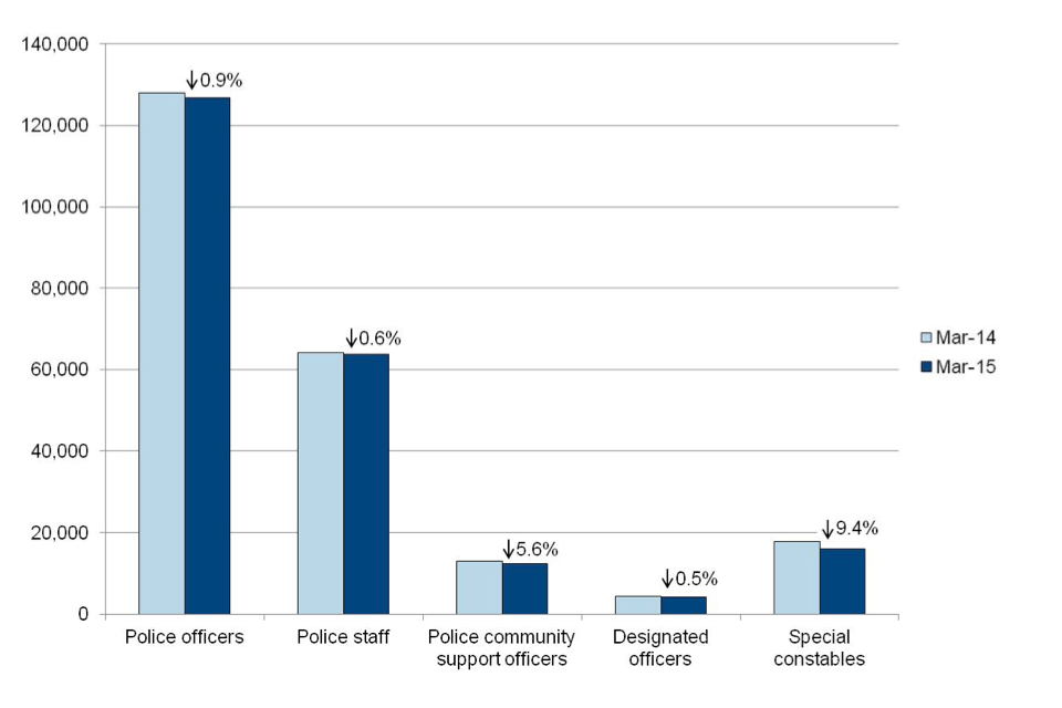 The number of police staff, PCSOs and designated officers has fallen between 31 March 2014 and 2015, with the largest fall seen for PCSOs (5.6% or 735 PCSOs).