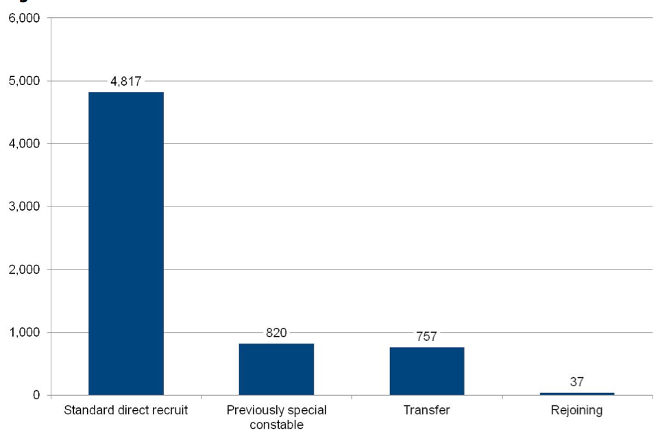 Figure 10 shows that the majority of police officer joiners between 1 April 2014 and 31 March 2015 were standard direct recruits (4,817 or 74.9%), meaning they were not transfers, re-joiners or were not previously special constables. The method through which police officers joined the police has changed over the last few years, with proportionally more officers being standard direct recruits and fewer officers who were previously special constables.