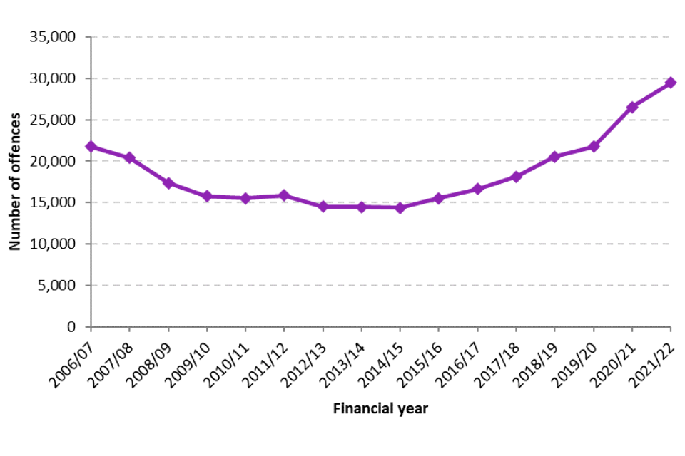 Figure 1 shows the time series trend for the offence “assault without injury on a constable”, which is comparable over time. Between the years ending March 2007 and March 2010 there had been a general downward trend in the number of offences of “assault without injury on a constable” recorded by the police. It then remained stable until the year ending March 2015, when the number of offences increased by 8%, from 14,369 to 15,512 offences (a smaller increase than the 26% over the same period for victims of the offence of “assault without injury”). Since the year ending March 2015, there has been an upward trend in the number of offences of “assault without injury on a constable” recorded by the police. In the year ending March 2022, 29,491 offences of “assault without injury on a constable” were recorded by the police, an 11% increase compared with the previous year (compared with an increase of 20% over the same period for all “assault without injury” cases).