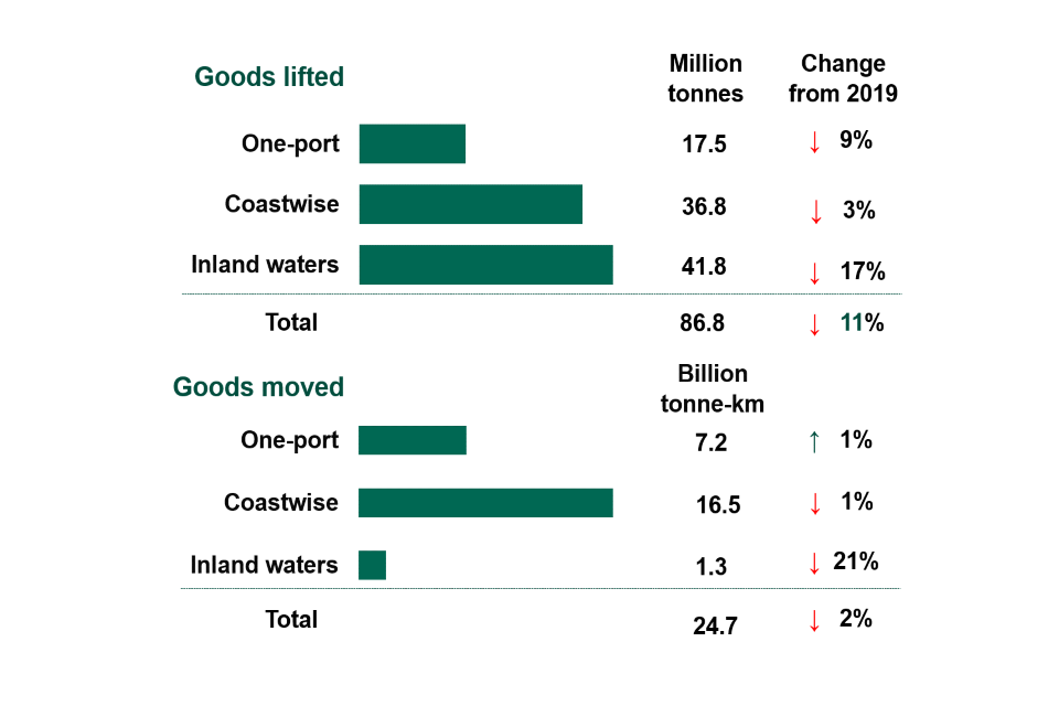 Note: Coastwise and one port traffic which travels on inland waterways is counted twice in the above figures (so total goods lifted is less than the sum of the 3 individual categories).