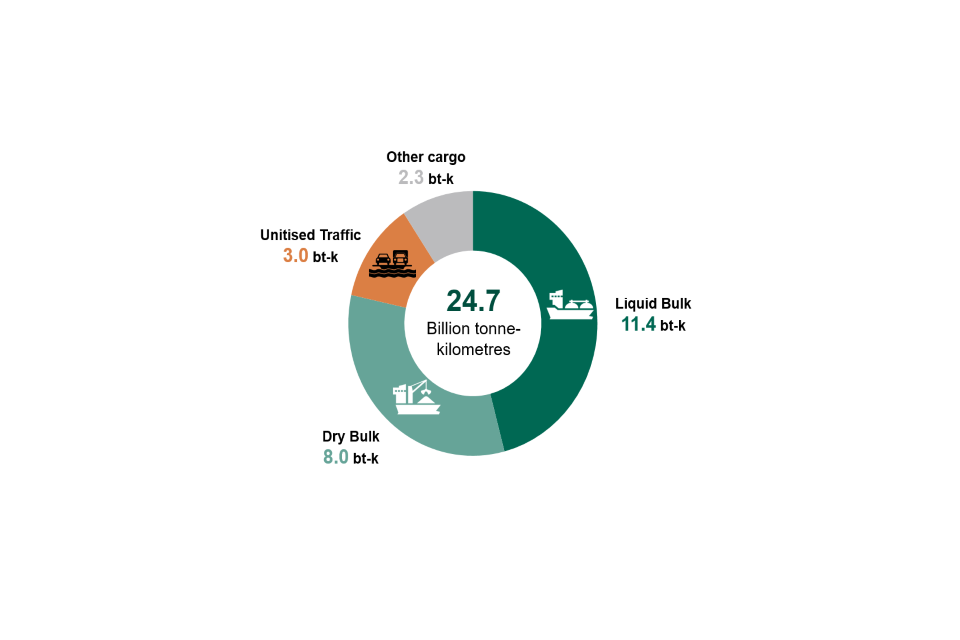 For goods moved, liquid bulk remains the most transported cargo type along domestic waterborne routes (46%) in 2020, followed by dry bulk (32%), which is consistent with last year. Despite the declining trend in liquid bulk since 2000 associated with the decline in North Sea oil, the majority of the liquid bulk cargo continues to come from crude oil and oil products. Dry bulk is mainly composed of aggregates extracted from the seabed. Unitised traffic (Roll-on, Roll-off and Lift-on, Lift-off) accounted for 12% of all tonne-kilometres decreasing 3 percentage points from last year. In terms of tonnes lifted, Ro-Ro (Roll-on, Roll-off) and Lo-Lo (Lift-on, Lift-off) account for a larger proportion (24%), suggesting that this cargo type doesn’t travel as far as liquid bulk and dry bulk.