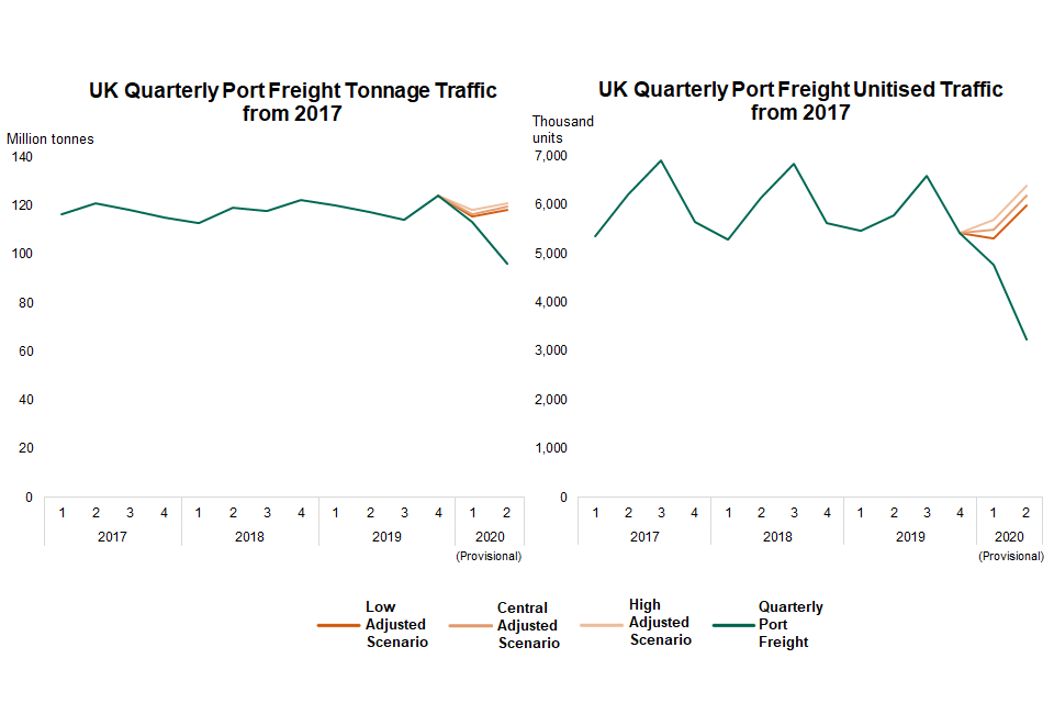 The impact of coronavirus on port freight can be estimated by comparing provisional 2020 traffic statistics to the port freight forecasts (adjusted as described in the below note on method). The comparison below shows that the first two quarters of 2020 were lower than levels expected pre-pandemic, even compared to the low scenario.