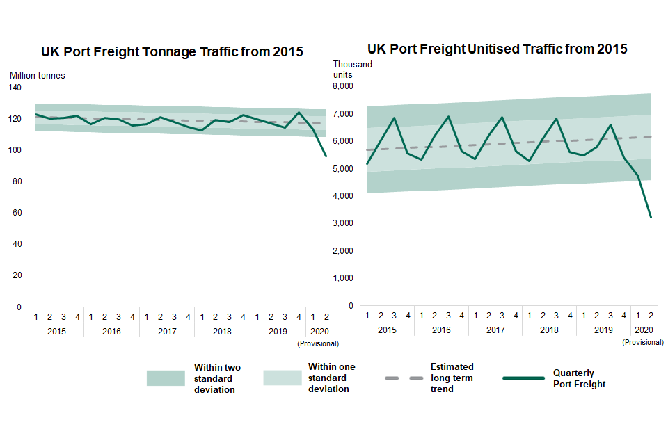 Unitised traffic has tended to remain within one standard deviation from the trend, with a very regular seasonal variation. Tonnage traffic has varied slightly more than unitised traffic over time around the long-term trend and does not follow a very regular seasonal pattern, but has remained within the wider range of two standard deviations from the trend. As can be seen from the charts, 2020 figures for both tonnage and units have fallen far below historical variability, showing the impact coronavirus and related effects of coronavirus (e.g. on the economy) may have had on port freight traffic.