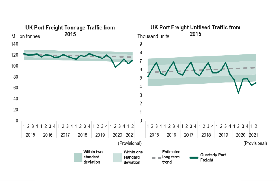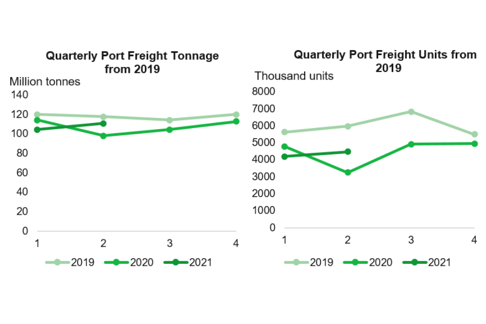 In the fourth quarter of 2020 (October to December), tonnage was back within 1 standard deviation of pre-pandemic variability, while unitised traffic was within 2 standard deviations in both the third and fourth quarters. In the second quarter of 2021 (April to June), units remain below 2 standard deviations while tonnage shows some recovery.