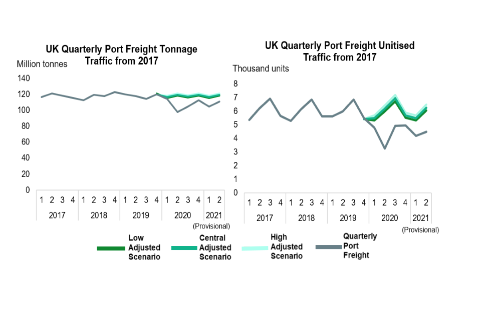 For past years, the annual DfT port freight traffic forecasts were adjusted so that the central scenario is in line with published annual port freight figures. 2020 to 2021 annual figures were scaled up based on the average adjustments made to the previous years. The low and high scenarios were then adjusted to keep the same yearly ratio to the central scenario. This is to adjust for the difference observed between actuals and forecasts for the years where the data has become available since forecasts were calculated.