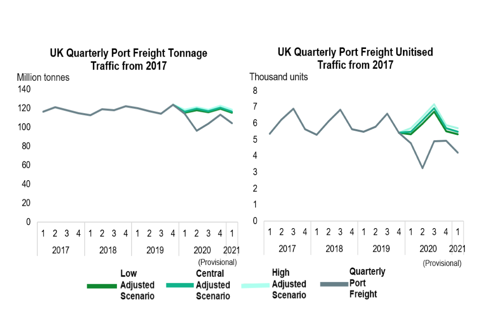 For past years, the annual DfT port freight traffic forecasts were adjusted so that the central scenario is in line with published annual port freight figures. 2020 to 2021 annual figures were scaled up based on the average adjustments made to the previous years. The low and high scenarios were then adjusted to keep the same yearly ratio to the central scenario. This is to adjust for the difference observed between actuals and forecasts for the years where the data has become available since forecasts were calculated.