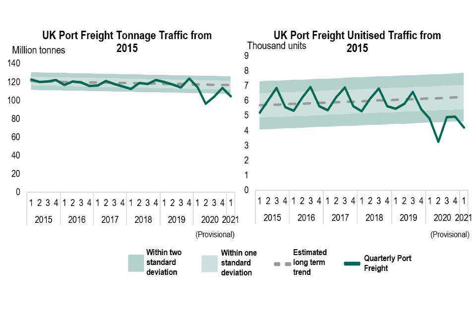 In the fourth quarter of 2020, tonnage was back within one standard deviation of pre-pandemic variability, while unitised traffic was within two standard deviations in both the third and fourth quarters. However, in the first quarter of 2021, both tonnage and units have fallen beyond two standard deviations again, related to further lockdowns in the UK as well as the unwinding of stockpiling in the lead to the end of the transition period with the European Union, as mentioned above