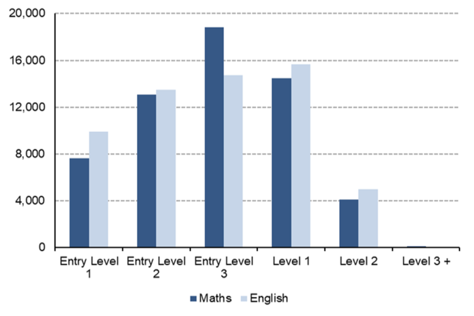 25% of maths and 27% of English initial assessment outcomes were at level 1 and 7% of maths and 9% of English initial assessment outcomes were at Level 2 or above.