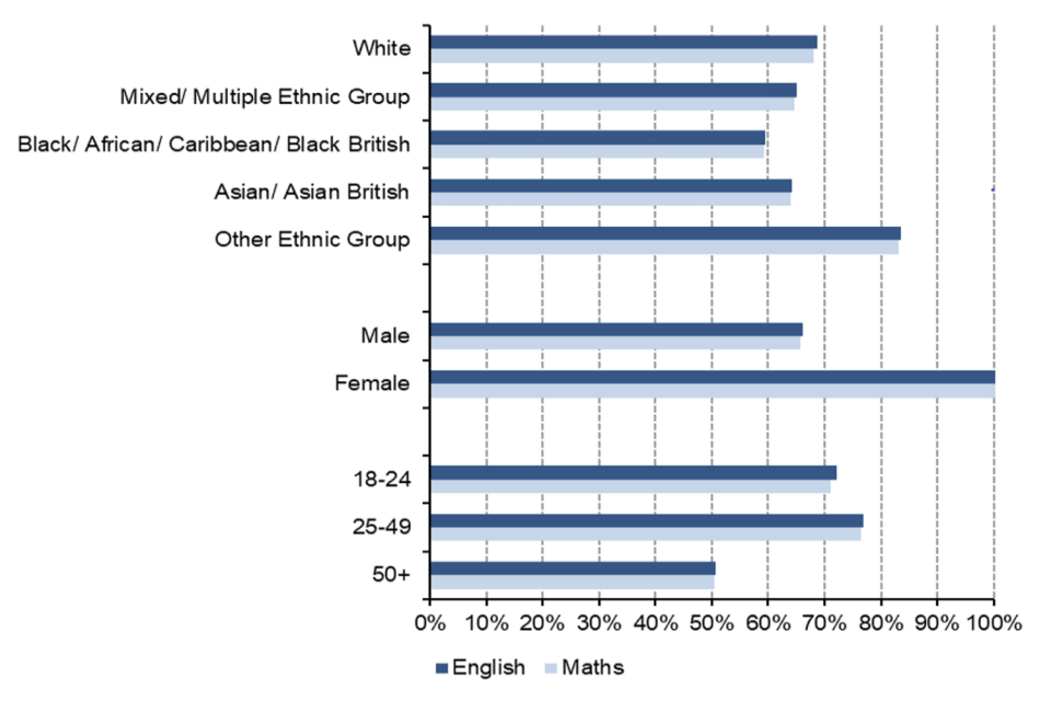 68% of maths and 65% of English initial assessment outcomes were at the entry levels 1-3. This was common across most demographic groups with the following exceptions: