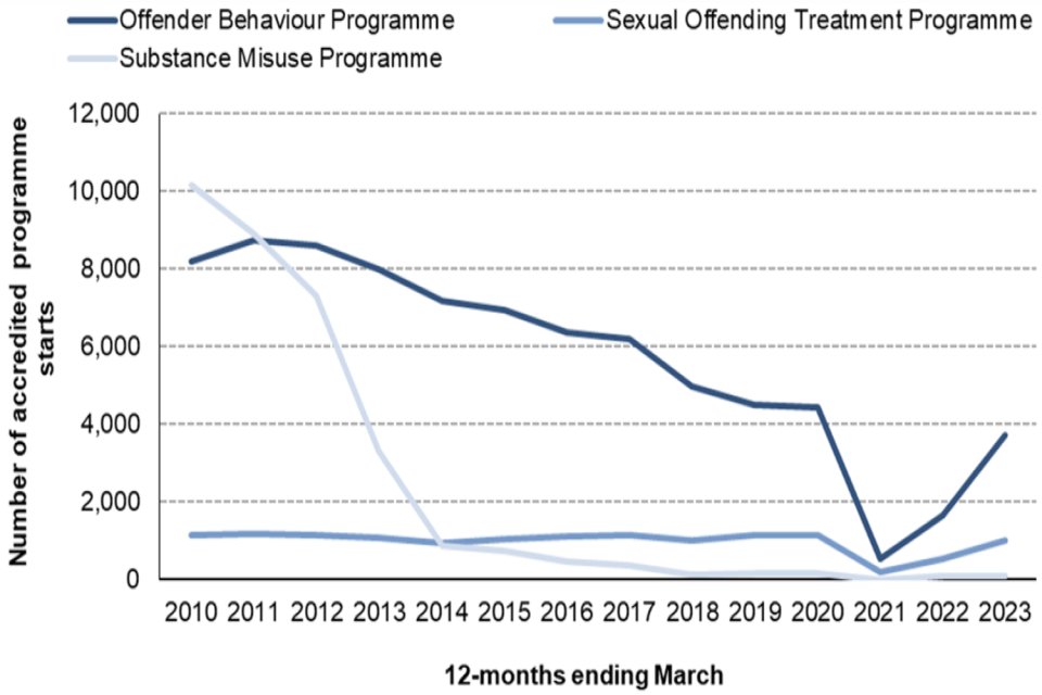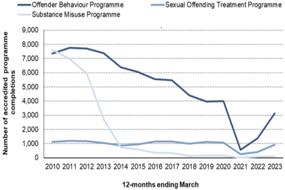 | The number of completions[footnote 10] for accredited programmes in custody increased | From 1 April 2022 to 31 March 2023, 4,136 accredited programmes were completed by offenders, representing an increase of 124% compared with the previous 12-month period. |