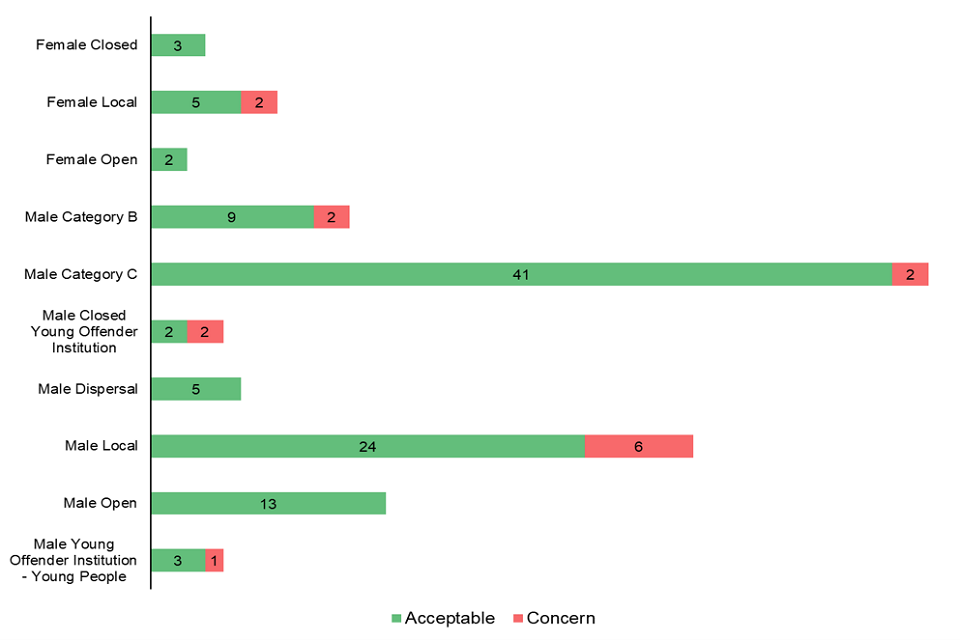 Two of the seven female local prisons (28.6%) and six of the thirty male local prisons (20%) were rated as ‘Performance is of concern in the circumstances of COVID-19’. Two of the four (50%) male closed YOI prisons and one out of four (25%) male YOI – young people prisons were rated as of concern.