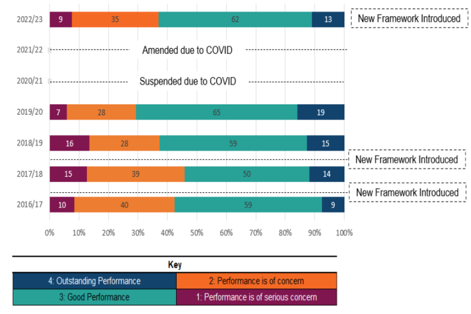 This publication covers reporting for the period between the 1 April 2022 and the 31 March 2023. A new prison framework was introduced in 2022/23 to assess prison performance. Different frameworks having been in use since 2016/17 in different years. Aggregated comparisons have been made in this bulletin as a guide to show how national distribution of ratings has changed over the years.