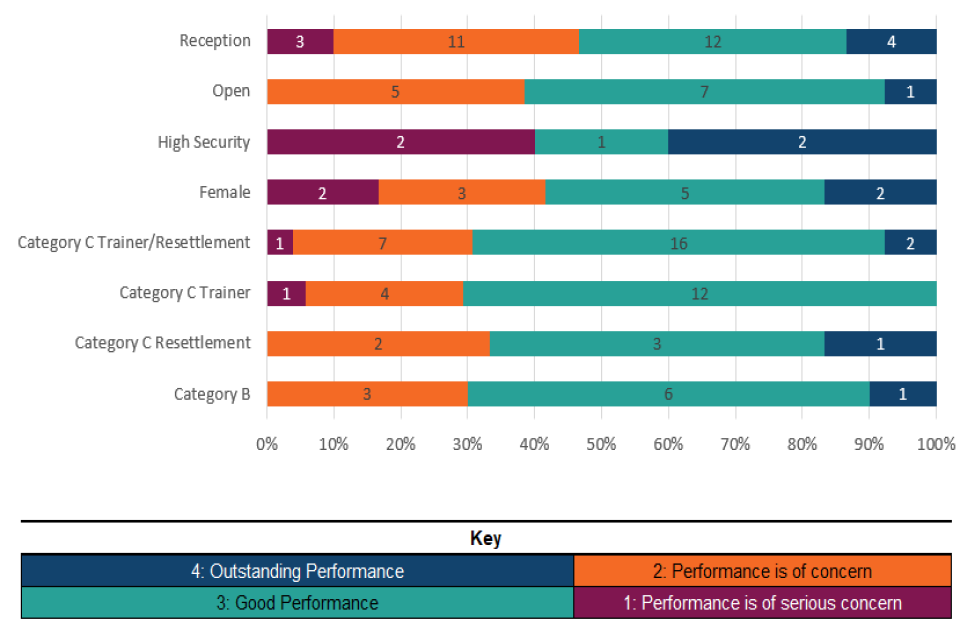 75 prisons (63.0%) were rated as either good or outstanding. All functional groups had prisons that were rated as good performance or better. 44 prisons (37.0%) were rated as either performance of concern or performance of serious concern.