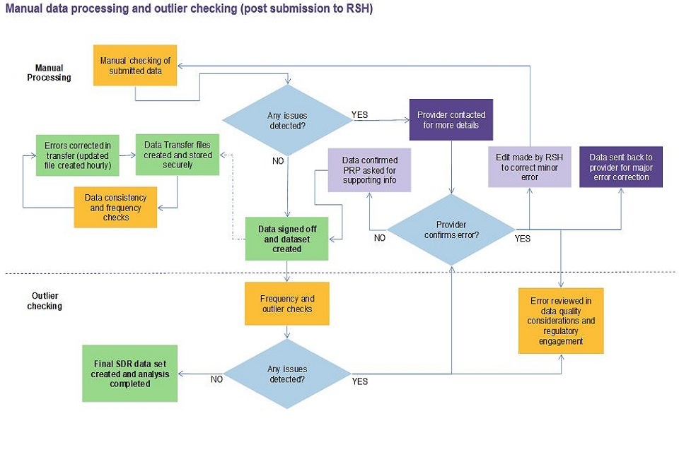 Manual inspections are systematically undertaken on all data submitted. All returns are checked for basic consistency and likely errors, for example where proportions of stock recorded as particular excepted categories are outside the expected range or where rents are particularly high or low. This includes comparison to previously submitted data with unexpected movements in stock levels or changes outside those anticipated in reported rent values being queried with PRPs. Where we identify a potential anomaly with the submitted SDR data, a query is raised with the submitting PRP. The sign-off of SDR returns is dependent on the resolution of all queries which could materially impact the quality of the published data. This overall checking process is outlined in the diagram in Annex A.