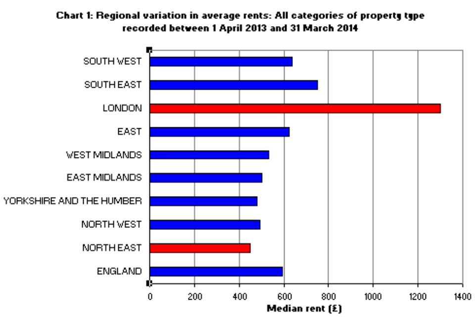 1) The median rent recorded between 1 April 2013 and 31 March 2014 in England was £595. The highest regional median rent was in London, £1300, and the lowest was in the North East, £450. (Note: changes across regions may be influenced by differences in the sample composition rather than true differences in the rents).