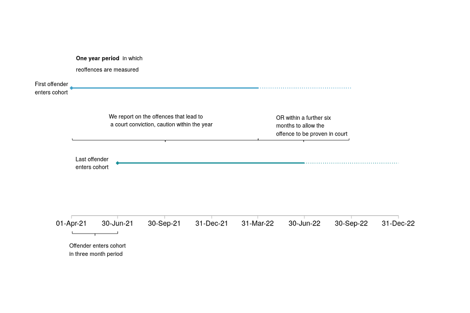 A proven reoffence is defined as any offence committed in a one-year follow-up period that leads to a court conviction, caution, reprimand, or warning in the one-year follow-up or within a further six-month waiting period to allow the offence to be proven in court. This is shown in the diagram below in relation to the latest offender cohort.