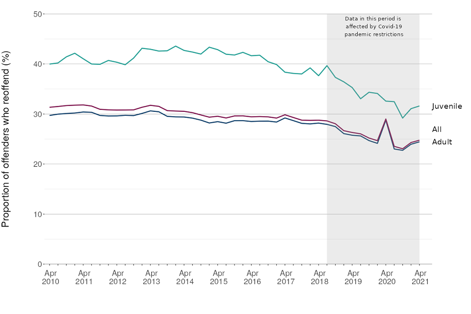 “Figures presented in this statistical release show proven reoffending statistics for the April to June 2021 offender cohort. Proven reoffences are measured over a one-year follow-up period and a further six-month waiting period to allow for offences to be proven in court.