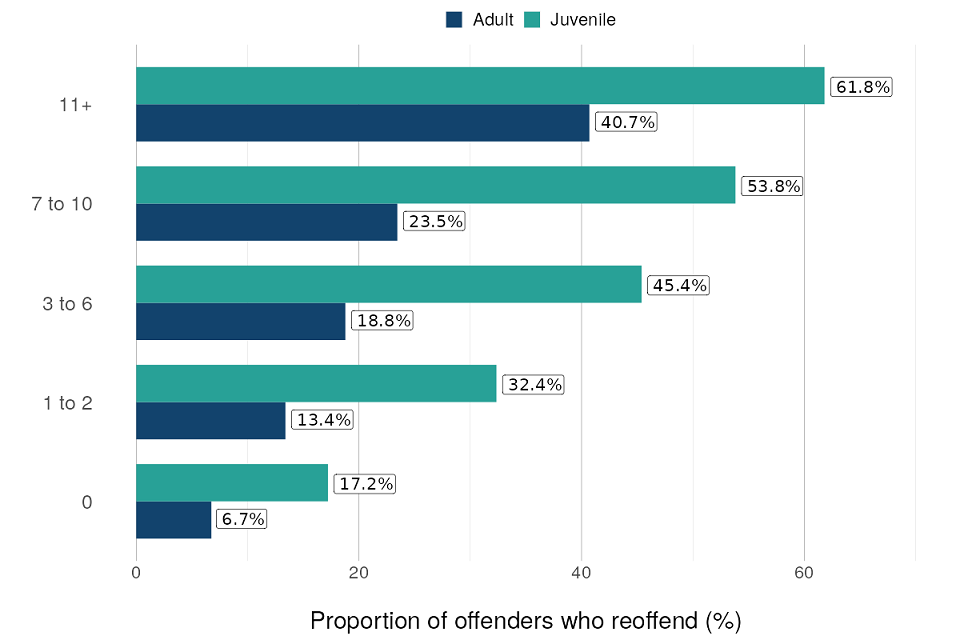 Offenders with 11 or more previous offences had the highest rate of reoffending (40.7% for adults and 61.8% for juveniles).