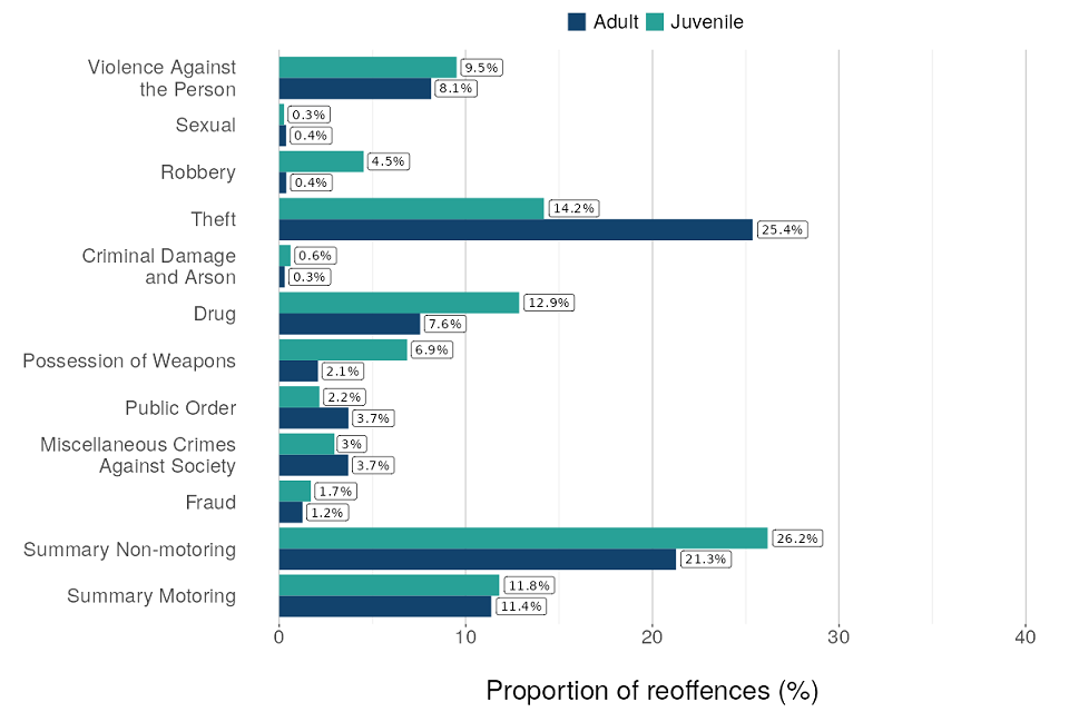 For the adult offender cohort, the highest proportion of proven reoffences (25.4%) were for theft (figure 7). For the juvenile offender cohort, summary non-motoring offences make up the largest proportion of reoffences (26.2%).